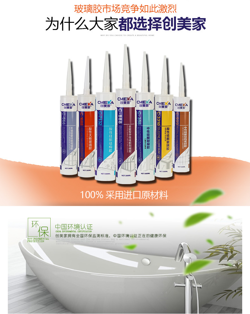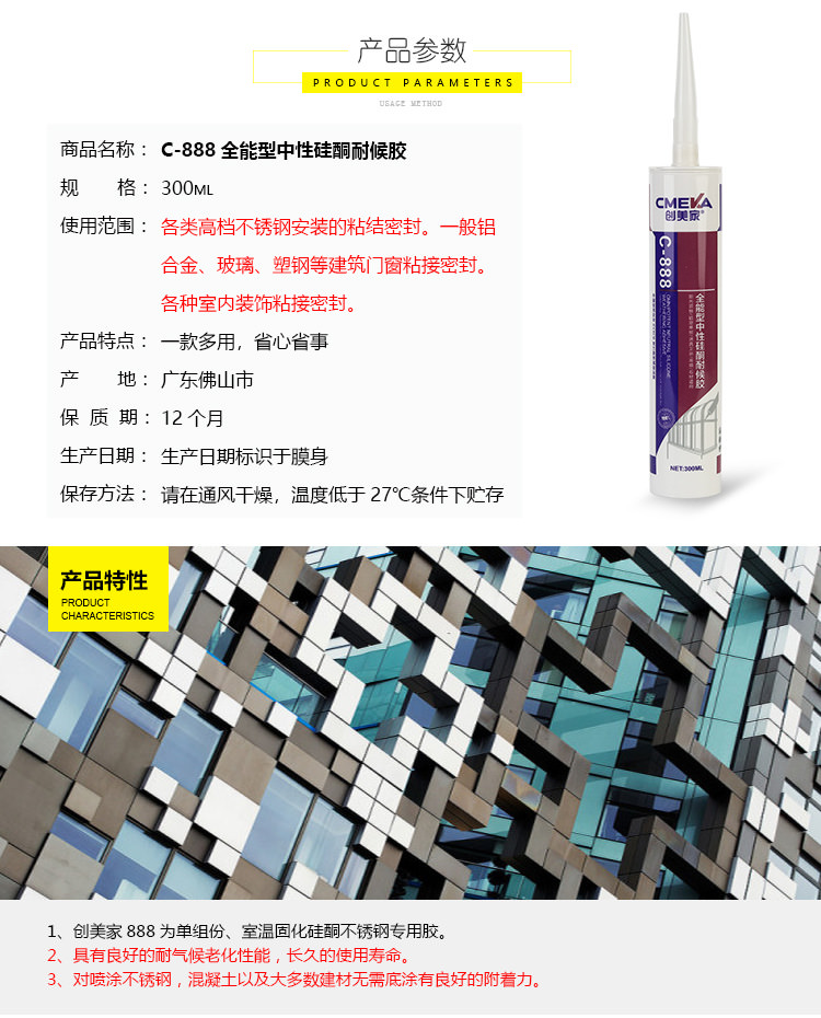 1、創美家C-888為單組份、室溫固化硅酮幕墻門窗工程膠。